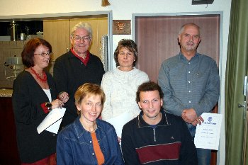 „Goldene Ehrennadeln“ mit Deutschen Meistern. Für 40-jährige Vereintreue wurden Susanne Oelke-Freese, Ottmar Langmack (Vertretung für seine Frau Thea), Birgit Kahlen und Wolfgang Kroker (oben v. li.), für nationale Titel Anette Hochmann und Andreas Simmer geehrt.