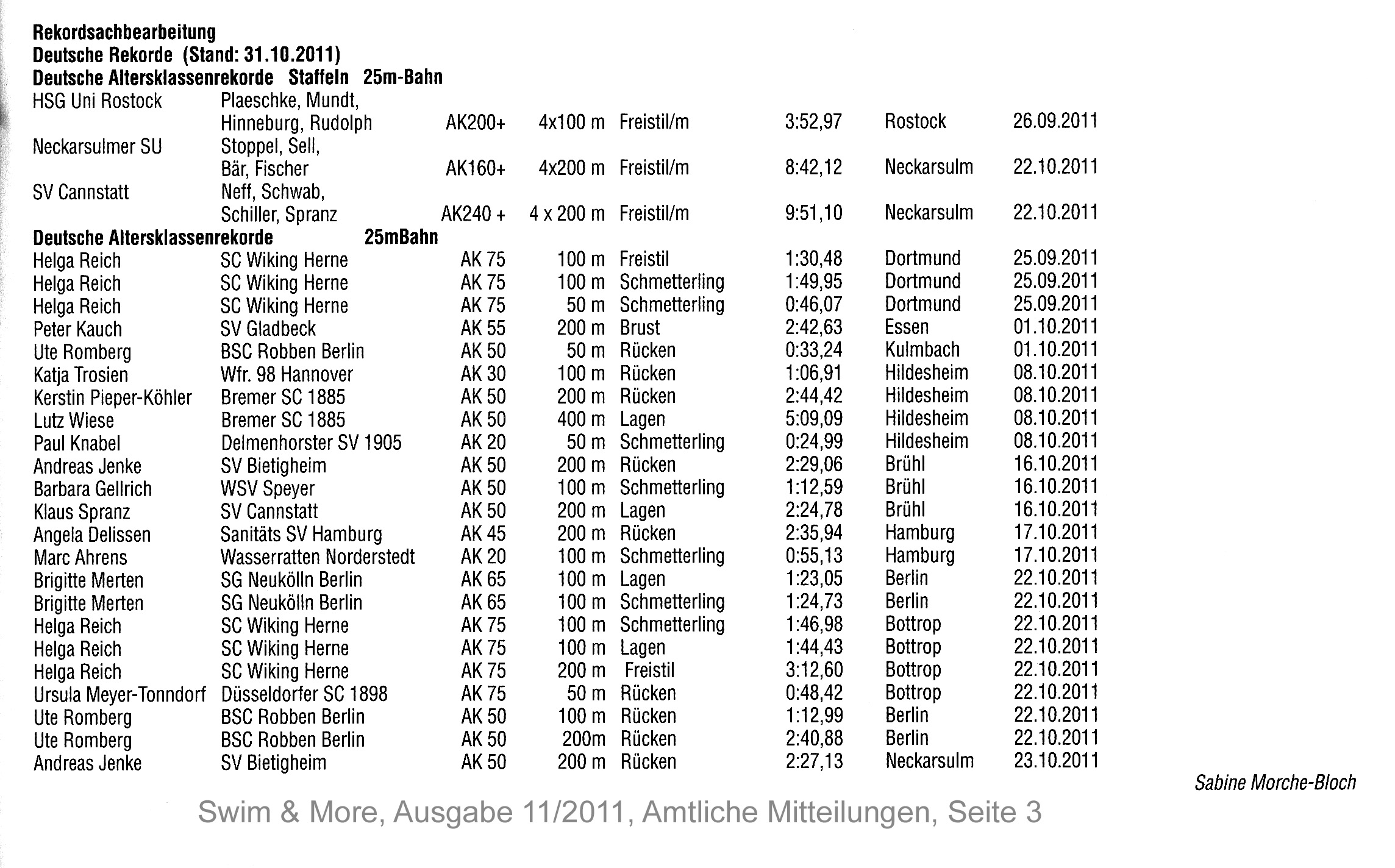 Eine herausragende Leistung lieferte Paul Knabel (AK 20) ab. Er verbesserte den deutschen Masters-Altersklassenrekord über 50 m Schmetterling auf 0:24,99 min. und sammelte dafür 1003 Punkte für das Mannschaftskonto. Natürlich ist dieser Altersklassenrekord auch Delmenhorster Stadtrekord. Nicht nur über 50m Schmetterling war er gut drauf, sondern auch über 100m Schmetterling (0:56,70 min.) und 100m Kraul (0:52,09 min.). Kraul war nicht nur neue Bestzeit, sondern auch wieder Stadtrekord! Bei seinen drei Starts holte er insgesamt 2875 Punkte für das Team.