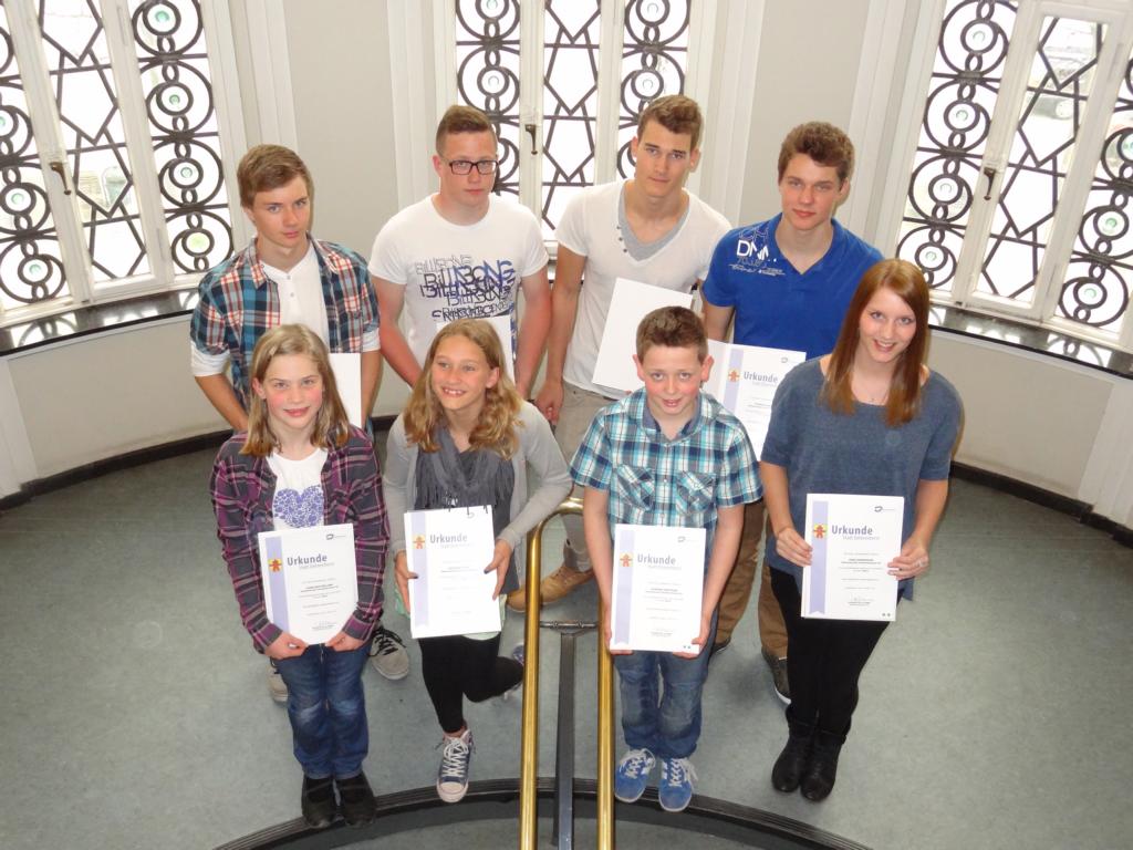 Die Sportler dieser Stadt zeigen auf Ihren Wettkämpfen Flagge. Und zwar die Ihres Vereins und die der Stadt Delmenhorst. Ihr sportliches Verhalten und Ihre Leistungen tragen unweigerlich positiv zum Image unserer Stadt bei. So sinngemäß die Worte des Bürgermeisters Patrick de La Lanne, der im Rathaus die erfolgreichsten Sportler der Stadt Delmenhorst zur Ehrung zu Gast hatte. Erfreulich dabei war die hohe Anzahl der zu ehrenden Schwimmsportler. Gleich 13 Aktive, davon 12 vom DSV05, freuten sich über die Auszeichnung. Alle samt Meister Ihrer Lieblingsschwimmlagen auf Landesebene und darüber hinaus. Zum obligatorischen Foto auf den Rathaustreppen reihten sich somit Victoria Dietz, Charleen Kölling, Vera Kemmesies, Dominik Sartison, Marc Hoffstedt, Leonard Dietz, Andre Schnakenberg und Thomas Labrenz ein. Zur Ehrung fehlten die Schwimmer Jörn Wolters, Paul Knabel, Felix Ahrens und Ilja Steinbrecher, die teilweise in Berlin auf den Deutschen Meisterschaften um Ruhm und Ehre kämpften. Aber auch in Berlin darf der Name der Stadt und unseres Vereins gerne verstärkt erscheinen.