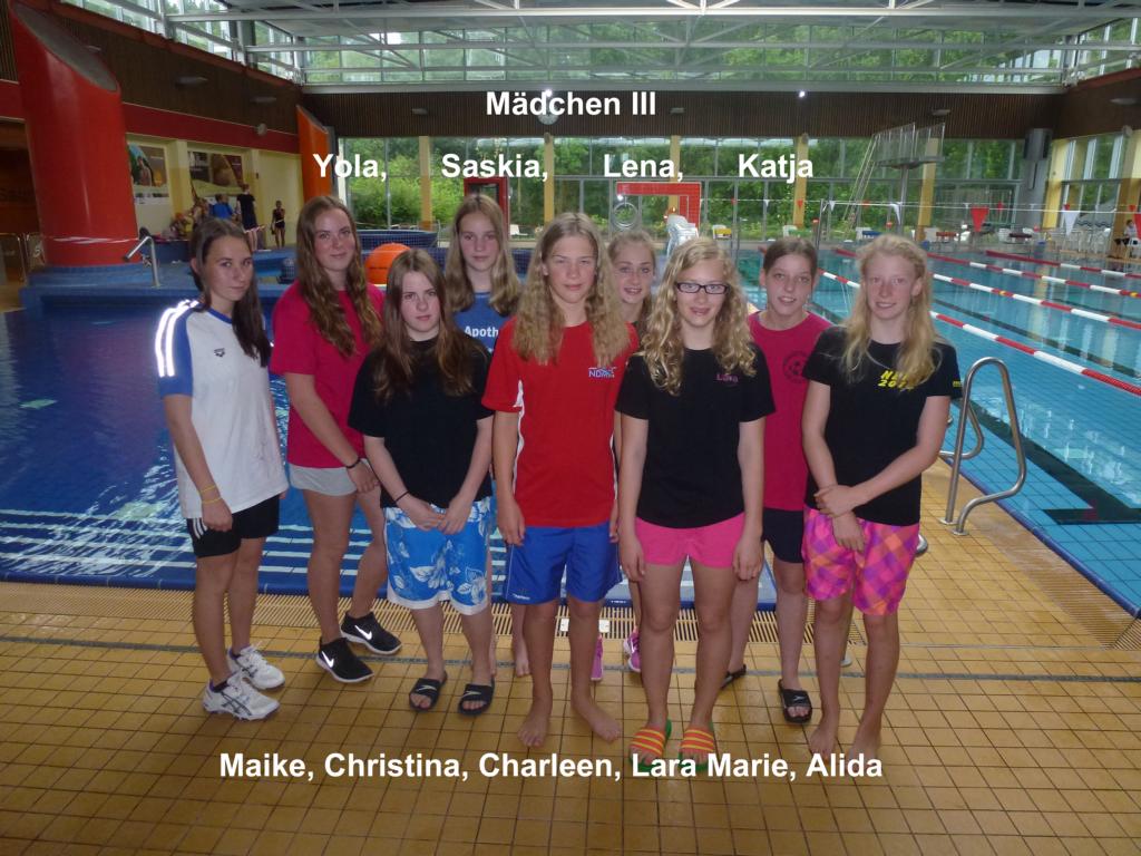 In der Wettkampfklasse Mädchen III starteten für ihr Gymnasium Maike Hinrichs, Yola Biermann, Christina Waltl, Saskia Neunaber, Charleen Kölling, Lena Anders, Lara Marie Lüllmann, Katja Kluthe, Alida Mühlenhort. Sie gehören alle den Jahrgängen 1999 bis 2002 an. Die Mädchen beherrschten ihre Altersklasse, gewannen beide Staffeln und konnten über alle drei Einzelstrecken den Sieg sichern, über Freistil und Rücken gab es sogar Doppelerfolge. So satnd am Ende mit über einer Minute Vorsprung der 1. Platz zu Buche.
