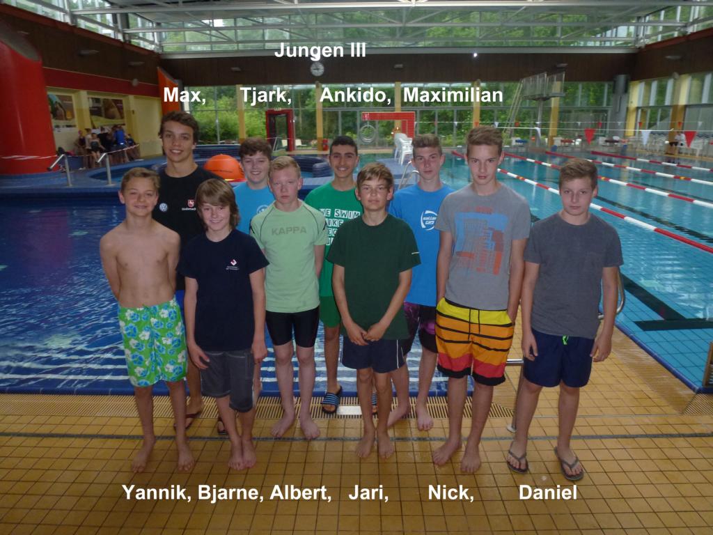 In der Wettkampfklasse Jungen III traten (ebenfalls aus den Jahrgängen 1999 bis 2002) Yannick Brandhorst, Max Lindenburger, Bjarne Krugjohann, Tjark Marahrens, Albert Sergejew, Ankido Amno, Jari Reuker, Nick und Daniel Scharf an. Sie konnten sich wie die Mädels beide Staffelsiege sichern, waren in den Einzelstrecken nicht ganz so überlegen. Am Ende gab es den 1. Platz mit 25 Sekunden Vorsprung.