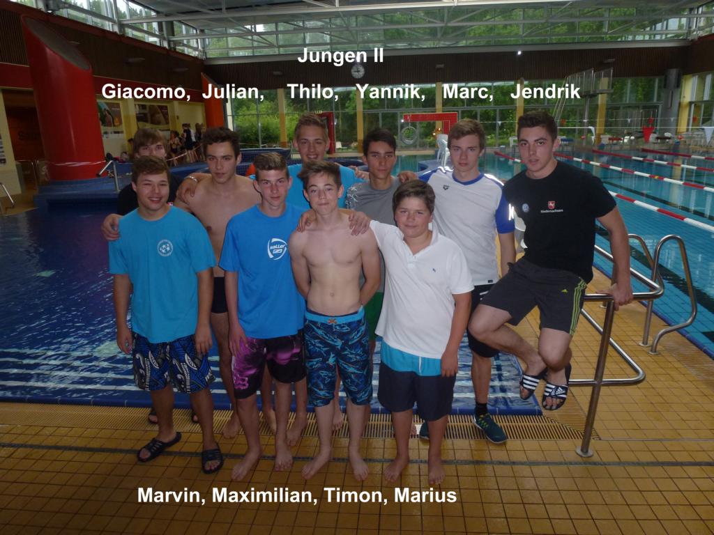 Hier starteten in der Wettkampfklasse Jungen II die Aktiven Giacomo Haack, Julian Helbig, Thilo Buckmann, Yannick Osterfeld, Marc Hoffstedt, Jendrik Kaluza, Marvin Krugjohann, Maximilian Miller, Timon Kaluza und Marius Flügger, alle aus den Jahrgängen 1997 bis 2000. Die Mannschaft konnte gleich zu Beginn die Lagenstaffel für sich entscheiden, überzeugte auch auf den Einzelstrecken, musste sich aber in der abschliessenden 8*50 m Freistilstaffel geschlagen geben und belegte so hinte dem Gymnasium Löningen mit 6 Sekunden Rückstand den 2. Platz.