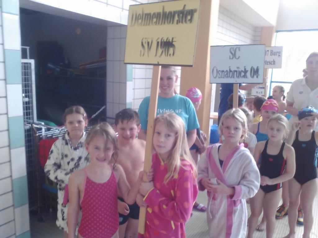 Am Sonntag, den 06.03.2016 fand im Schinkelbad in Osnabrück das OSC Kids Schwimmfest statt. Daran nahmen 7 Vereine mit 61 Schwimmern die insgsamt 211 mal starteten teil. Der DSV stellt mit Taje Kölling (09), Finja Fee Schubert (08), Mia Schröder (07), Jette Kriebisch (07) und Luca Lesse (07) fünf aktive Teilnehmer/innen. Dabei durften die jungen Nachwuchsschwimmer zeigen was sie im Training gelernt haben. Neben neuen Bestzeiten brachten die Kinder voller Stolz eine goldglänzende Teilnehmermedailie mit nach Hause. Das nächste Highlight folgte durch die Ehrung mit Urkunden auf dem Siegerpodest für die ersten drei Plätze, welche häufig durch DSVler belegt wurden. Bei 15 Starts sprangen 9 Podestplätze heraus. Insgesamt können alle mit den gezeigten Leistungen zufrieden sein und sich auf die nächsten Wettkämpfe freuen.