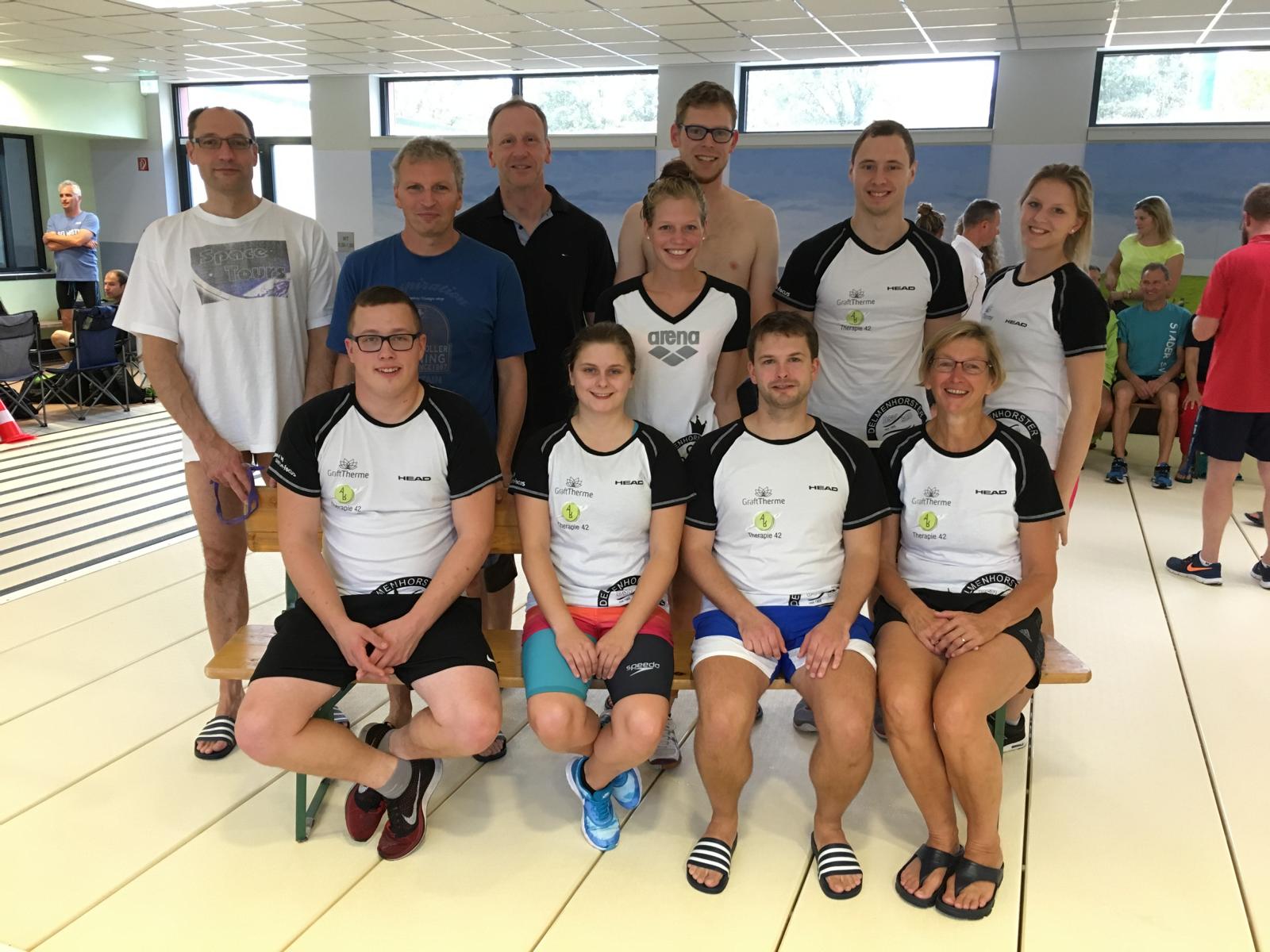 Am 30.Oktober 2016 war der DSV 05 erneut Ausrichter der Niedersächsischen Qualifikation zu den Deutschen Mannschaftsmeisterschaften der Masters. 14 Vereine aus Niedersachsen sowie drei Mannschaften aus Bremen gingen in der GraftTherme Delmenhorst an den Start. Die Stimmung in der Halle war großartig und so wurden die Aktiven zu guten Zeiten angefeuert. Jede Mannschaft musste festgelegte Bedingungen erfüllen. So mussten mindestens vier Frauen und vier Männer einer Mannschaft angehören. Es mussten mindestens fünf Altersklassen vertreten sein und jedes Geschlecht musste mindestens sieben Strecken schwimmen, wobei jeder Aktive höchstens drei mal schwimmen dürfte. Für den DSV 05 starteten Christoph Blaß, Carina Czienskowski, Carl-Henrik Ebbecke, Anette Hochmann, Matthias Karrasch, Martin Kroker, Vera Kemmesies, Sharina Sarnow, Tim Schaffarzyk, André Schnakenberg, Andreas Simmel, Wolf Teggemann und Kristin Teichmann (auf dem Bild fehlen leider Carl-Henrik und Kristin). Die geschwommenen Zeiten wurden, unter Berücksichtigung der entsprechenden Altersklasse, in Punkte umgerechnet. Gemeinsam erschwammen sie 13.886 Punkten und belegten damit einen beachtlichen 5. Platz im Landesentscheid, was bundesweit den 56. Platz bedeutet. Zu den Einzelergebnissen.