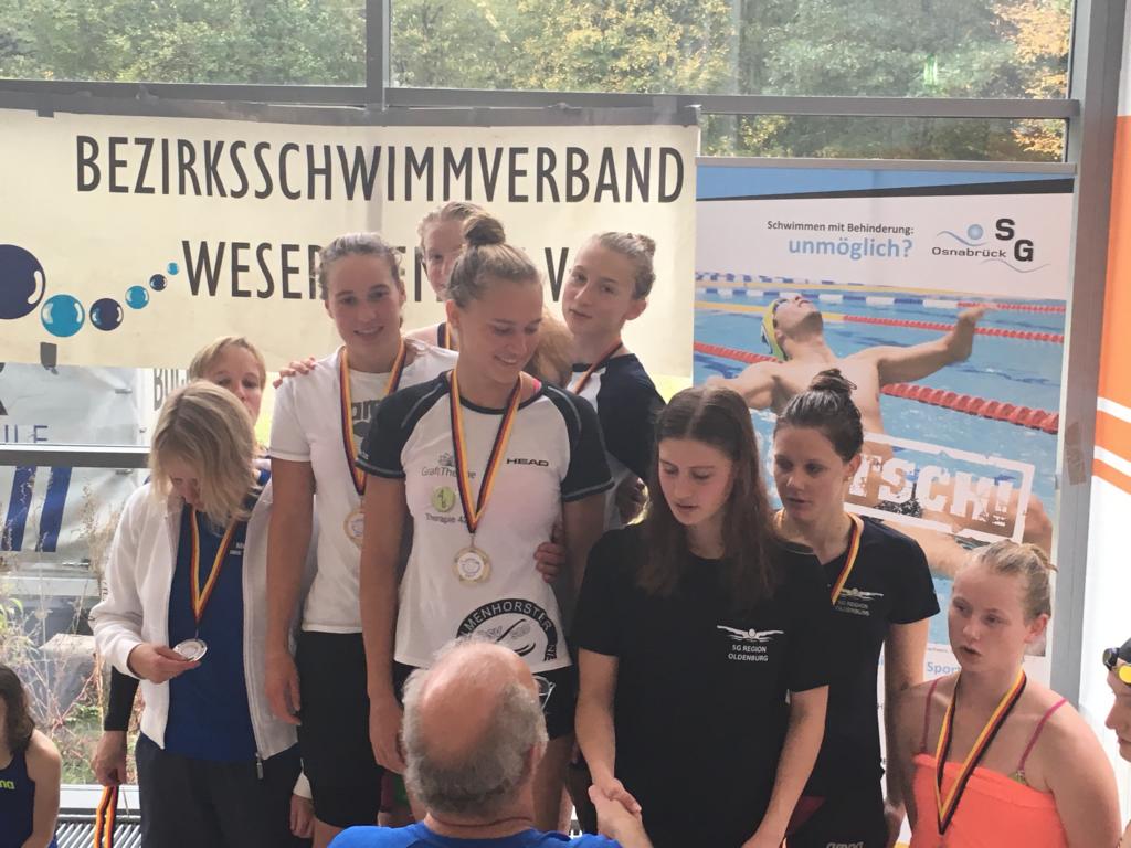 Bei den Bezirks-Kurzbahn-Meisterschaften vom 21.10. bis 22.10. im Sport- und Freizeitbad Nettebad in Osnabrück nahmen 39 Vereine teil. Mit einem Kontingent von 40 Schwimmer/innen stellte der Delmenhorster Schwimmverein die drittgrößte Anzahl an Starter/innen hinter den Startgemeinschaften aus Oldenburg und Osnabrück. Geschwommen wurden Distanzen zwischen 50 und 1500 Meter in den verschiedenen Disziplinen. 51 Gold, 23 Silber und 26 Bronzemedaillen fischten die Delmenhorster bei Ihren Einzelstarts aus dem Becken.