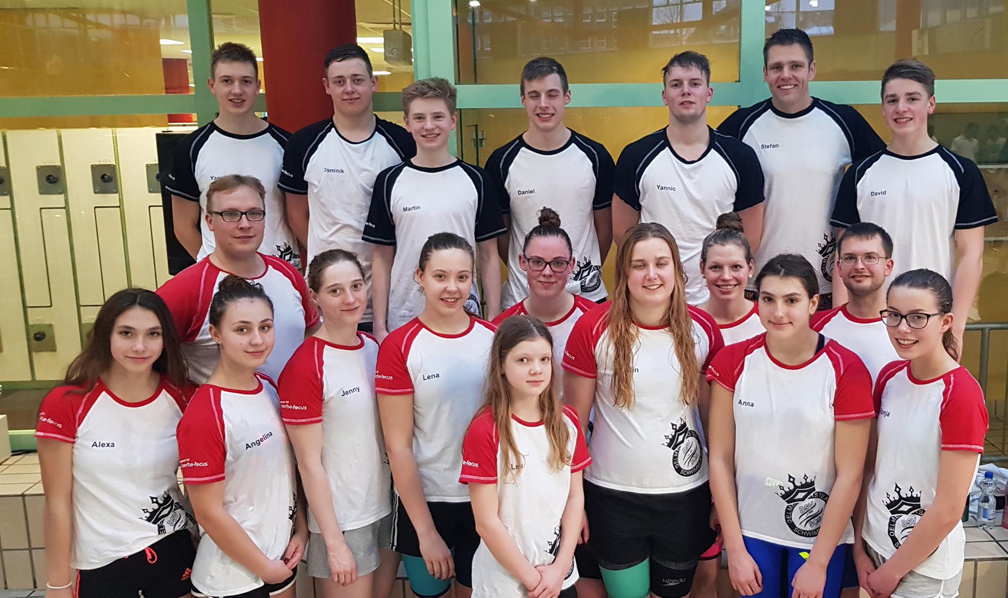 Yannis Hein unterbot den alten Vereinsrekord über 100 Meter Brust von 2013 um mehr als eine halbe Sekunde. David Zeiser schwamm auf 1500 Meter Freistil sogar mehr als sieben Sekunden schneller als die alte Vereinsbestzeit aus 2010. Ebenso in Hildesheim erfolgreich dabei waren Marc Hoffstedt (fehlt auf dem Foto), Martin Leis, Stefan Lemmermann, Dominik Sartison, Daniel Scharf und Yannic Ziegler.