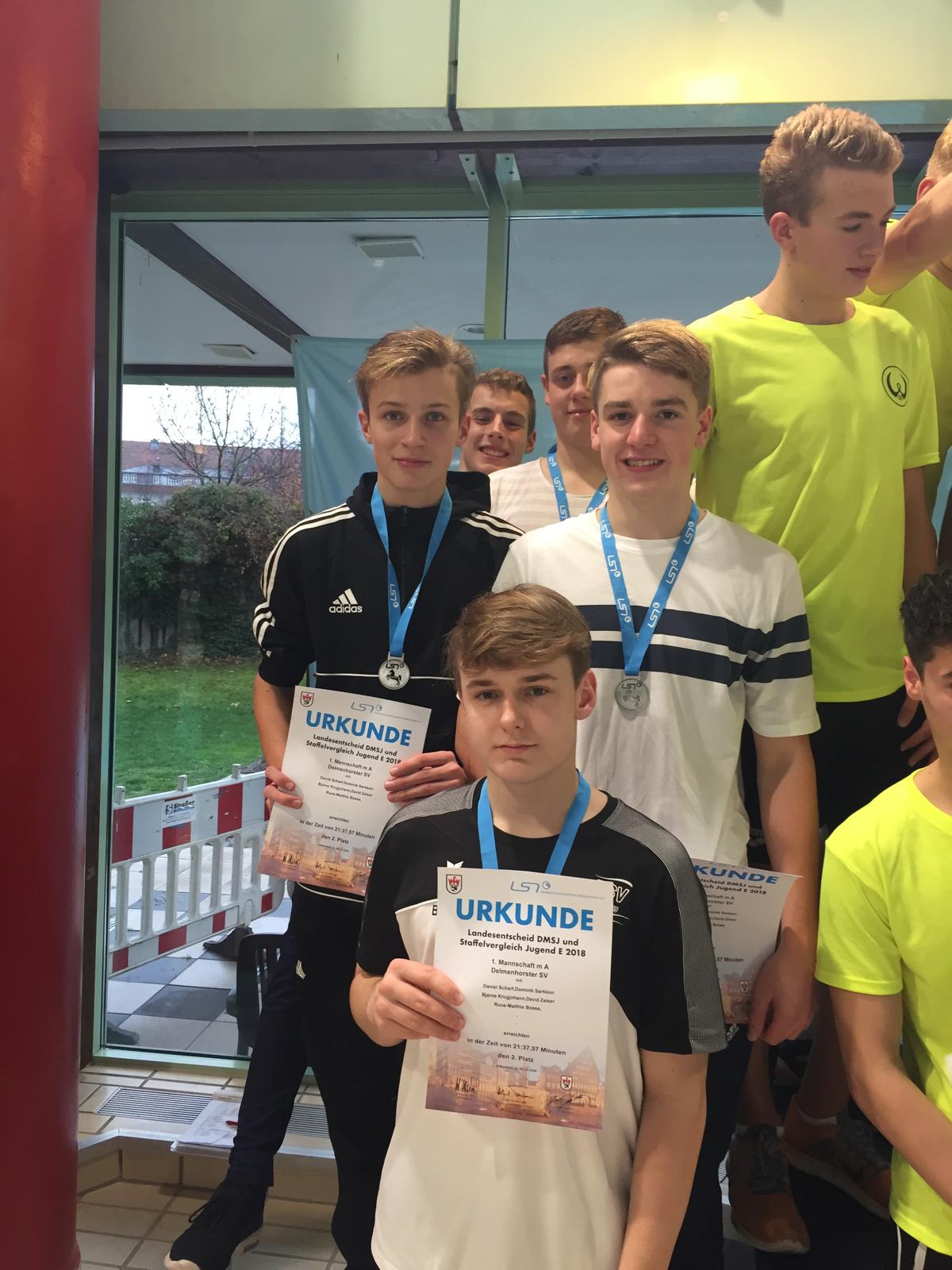 Die einzige männliche Mannschaft der Jugend-A (2001-2002) mit Dominik Sartison, Daniel Scharf, Bjarne Krugjohann, Rune Mattis Bosse und David Zeiser verteidigte ihren 2 Qualifikationsplatz souverän vor den Mannschaften aus Braunschweig und Osnabrück. Nur die Schwimmer aus Hannover waren schneller unterwegs und somit durften die Jungs eine silberne Landesmedaille mit nach Delmenhorst nehmen.