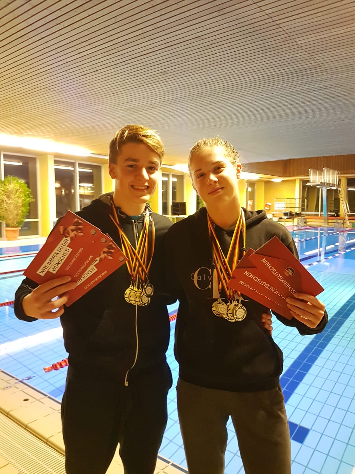 Gold glänzend präsentierten sich auch Lea Sophie Baechler, Pia Müller und Celine Rüdebusch. Sie schlugen bei ihren Starts über 400 Lagen und 800 Freistil in ihren Jahrgängen als erste an. Ebenso wie Anna Blum, die über 800 Freistil siegte. Silber Medaillen gingen an Aron Denker, Lukas Leis, Martin Leis, Hanna Lemmermann, Alida Mühlenhort und Dominik Sartison. Bronze an Anna Blum, Angelina Dzhumelya, Meret Meyer und Dominik Sartison.