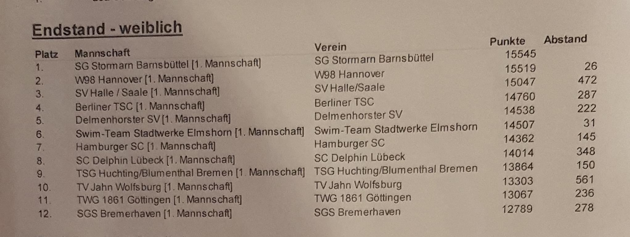 14.538 Punkte, welche sie laut Trainer Björn Lippel mit einem starken zweiten Abschnitt erreichten, bedeutete am Ende den fünften Platz unter Zwölf vertretenen Teams, somit ist der Verbleib in der zweithöchsten Klasse des Deutschen Schwimmverbandes für 2020 souverän gesichert.