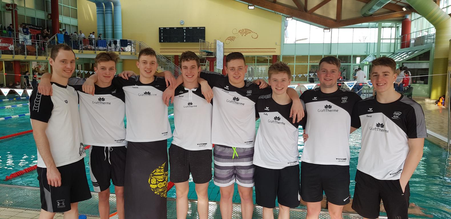 Mit einer Steigerung um über 1000 Punkte erreichte die Achtköpfige Mannschaft mit Rune-Mattis Bosse, Yannis Hein, Martin Leis, Matthias Karrasch, Dominik Sartison, Daniel Scharf, Yannik Ziegler und David Zeiser den ungefährdeten Sieg, wobei David Zeiser es den Mädchen nicht allein überlassen wollte neue Vereinsrekorde zu schwimmen.