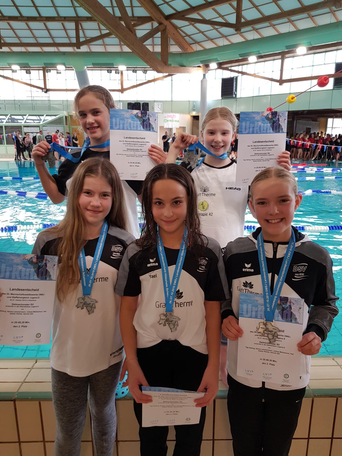 Die weibliche D-Jugend unterbot ihre vor 4 Wochen auf gestellte Bezirkszeit um mehr als eine Minute und sicherte sich mit dieser Leistungssteigerung die silberne Landesmedaille. Nur die Schwimmer vom Swim Team Pattensen mussten Taje Kölling (09) Hanna Zäh (08), Hannah Lemmermann (08), Juliana Mühlenhort (08) und Yael Esther Rohde (08) mit über 20 Sekunden Vorsprung an sich vorbeiziehen lassen.