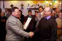 Völlig überrascht und sichtlich gerührt war Günter Ralle, langjähriger Trainer und Vorstandsmitglied im Delmenhorster Schwimmverein, als er unter einem Vorwand in das Schwimmerheim gelockt worden war und dort plötzlich seine ehemaligen Schützlinge und Vorstands-Mitstreiter vorfand, die mit ihm seinen 70. Geburtstag feiern wollten. Aus ganz Deutschland und sogar aus Übersee waren insgesamt 70 Gäste angereist. Bis zum Schluss war es ihnen gelungen, alles vor dem Jubilar geheim zu halten. Auch der DSV 05 sich nicht lumpen. Der Stellvertretende Vorsitzende Dieter Dannemann überreicht Günter Ralle (rechts) hier ein Geschenk und ernennt ihm zu Ehrenmitglied. Foto: Schilling