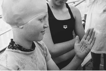 Damit sie ihren Start nicht verpaßt, hat sich Ann-Katrin Spille - wie viele andere Schwimmer und Schwimmerinnen auch - in die Hand geschrieben, in welchen Rennen sie auf welcher Bahn startet. Foto: Tobis Mit einem erfolgreichen Aufgebot war auch der Delmenhorster SV am Start, wobei Saskia Hartsch (88) gleich dreimal gewann. Ganz vorne landete sie in 3:48,92 über 200 m Rücken, 1:38, 58 über 100 m Freistil und 0:49,02 über 50 m Rücken. Außerdem gewannen Michael Meyer (88) in 3:55,08 über 200 m Brust, Niklas Bolte (89) in 2:26,85 über 100 m Rücken und 1:37,99 über 50 m Delphin, Nele Charzinski in 2:17, 86 über 100 m Freistil und 2:51,36 über 100 Rücken, Merle Münster Johann (7) in 0:52,34 über 50 m Freistil, Carina Schröter (88) in 1:55,45 über 100 m Brust.