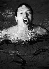 "Brustschwimmen strengt mich fürchterlich an", resümierte der Schwimmer, "und ich dachte immer, fürs Delphinschwimmen brauche ich sämtliche Bandscheiben." Die hat er eigentlich nicht mehr, braucht er dann wohl auch nicht.