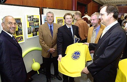 DSV-Vorsitzender Jörg Behrens (rechts) zeigt zusammen mit Oberbürgermeister Carsten Schwettmann das gelbe Vereins-Trikot der Wettkampfschwimmer. Zum Jubiläum gratulierten auch Bezirksverbands-Chef Tjark Schröder (links), Stadtsportbundvorsitzender Manfred Theilen (2.v.l.) und der Chefarzt der Kinderklinik des städtischen Krankenhauses, Dr. Johann Böhmann. FOTO: Tammo Ernst