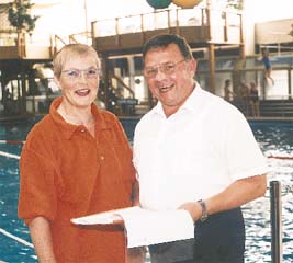 Dieter Dannemann übergibt seine Übungsleiterunterlagen für die Anfängerschwimmgruppe des Delmenhorster SV 05 an seine Nachfolgerin Doris Schierding. Der DSV hat dem rührigen Dannemann, derzeit stellvertretender Vorsitzender des DSV, viel zu verdanken. Foto: Ernst jm Delmenhorst. Nach jahrelanger aktiver Mitarbeit, sowohl als Übungsleiter als auch in verschiedenen Vorstandsämtern innerhalb des Delmenhorster Schwimmvereins, gibt Dieter Dannemann, inzwischen stellvertretender Vorsitzender, seine Übungsleitertätigkeit aus gesundheitlichen Gründen auf.