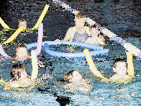 Neben den etablierten Wettkampfschwimmern kamen auch die jüngsten Wasserratten zu einem Einsatz. Die Freischwimmergruppe durfte über eine Bahn lang ihr Können zeigen, während die Seepferdchengruppe mit Poolnoodles (bunte Schwimmhilfen) die Zuschauer unterhielt.
