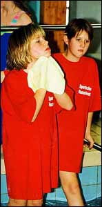Ein Großteil der Siege ging auf das Konto der SG Sportschule/Landesschwimmverband Bremen. Alle sind Mitglieder der beiden Sportklassen der Bremer Partnerschule des Leistungssports an der Ronzelenstraße. Dort werden seit Beginn des vergangenen Schuljahres Talente besonders gefördert. Die kleinen Schwimmer waren an ihren nagelneuen roten T-Shirts sofort zu erkennen, 34 an der Zahl. "Die T-Shirts haben wir heute morgen erst bekommen", erzählen die beiden elfjährigen Viola Matzat und Jana Günther. Sechs Mal pro Woche trainieren die beiden, haben sich zeitlich verbessert und waren zufrieden.
