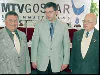 Ernst Walther de Haas (rechts), Ehrenvorsitzender des Delmenhorster SV 05, und Dieter Dannemann (links), stellvertretender Vorsitzender des Schwimmvereins, wurden wegen ihrer Verdienste um den Schwimmsport auf dem Verbandstag in Goslar vom Landes-Präsidenten Götz Gero Möller (mitte) geehrt. De Haas erhielt die Goldene Ehrennadel des LSN, Dannemann wurde mit der Silbernen Ehrennadel ausgezeichnet.