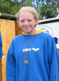 Sarina Manott (92) gehört zum jüngsten Jahrgang, der bei den Deutschen Jahrgangsmeisterschaften starten darf. Die Zwölfjährigen müssen hier einen Jugendmehrkampf absolvieren, der außer dem Schwimmen auf Zeit in verschiedenen Lagen mehrere technische Prüfungen beinhaltet. Sarinas Ziel war hier, die erforderlichen 2.500 Punkte zu erreichen und in 100m Rücken unter die ersten sechs ihres Jahrgangs zu kommen. Über dieses Ziel ist sie weit hinausgeschossen: 50m Kraul-Beine beendete sie in 0:44,42 min und auf Platz 24, in 400m Freistil steigerte sie ihren persönlichen Rekord um 8 Sekunden und belegte mit 5:07,29 min Platz 25. Dann folgte ihre eindeutig stärkste Disziplin, die 100m Rücken. In 1:13,46 min schlug sie als Fünfte ihres Jahrgangs an, wobei sie bei der 50m-Wende sogar auf Platz zwei lag, das hohe Anfangstempo aber leider nicht halten konnte. Mit der phantastischen erreichten Zeit unterbot sie jedenfalls schon jetzt die Norm für die Deutschen Jahrgangsmeisterschaften im nächsten Jahr, "und dann möchte ich hier in den Finallauf kommen!", strahlte Sarina am Ende des Wettkampfs. Schließlich startete sie noch in 100m Freistil, hier verbesserte sie ihre Rekordzeit um 1,8 Sekunden auf 1:05,81 min und schwamm so auf Platz 15. Zum Schluss musste sie noch über 200m Lagen ins Wasser, eine Disziplin, die Sarina nicht ganz behagt, doch überraschte sie hier mit einer erneuten Steigerung ihrer persönlichen Höchstleistung um ganze 7 Sekunden auf 2:45,69 min. Am Ende bekam Sarina 2.591 Punkte und belegte einen hervorragenden 24. Platz.