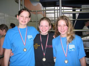 Die Zwillinge Vera und Pia Kemmesies (Jg.95) hatten schon ein wenig mehr Erfahrung, Pia holte eine Silbermedaille in 50m Brust (0:53,76 min), Vera schlug hinter ihrer Schwester als Dritte an (0:54,06 min). Stolz auf ihre Goldmedaille in 50m Delphin (0:50,58 min) war Mareike Schumacher (Jg.95). Silbermedaillen gewannen auch Julian Watzke (Jg. 94) in 50m Rücken (0:58,20 min) und Andre Schnakenberg (Jg. 95) in 50m Brust (0:54,39 min). Lucas Siemers (Jg. 94) schließlich erkämpfte sich in 50m Rücken (0:58,61 min) eine Bronzemedaille.